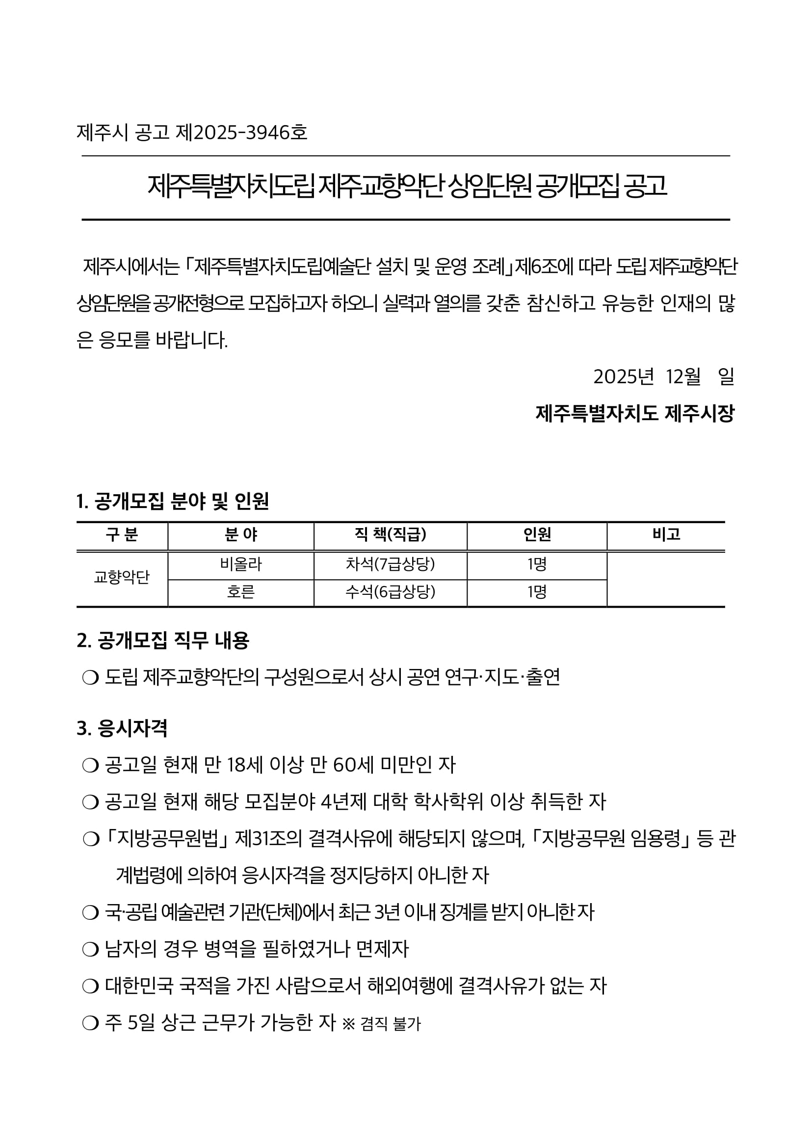 제주특별자치도립 제주교향악단 상임단원 공개모집 공고