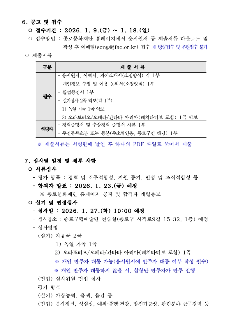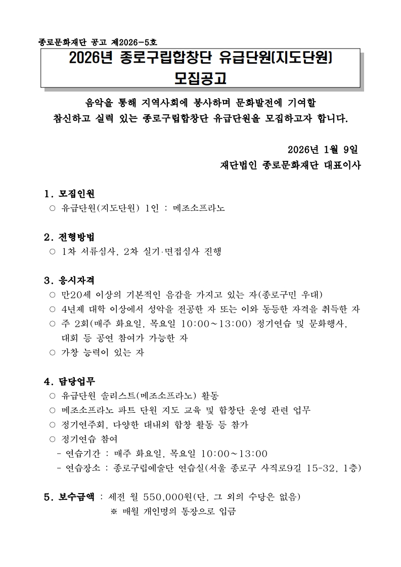 2026년 종로구립합창단 유급단원(지도단원) 모집
