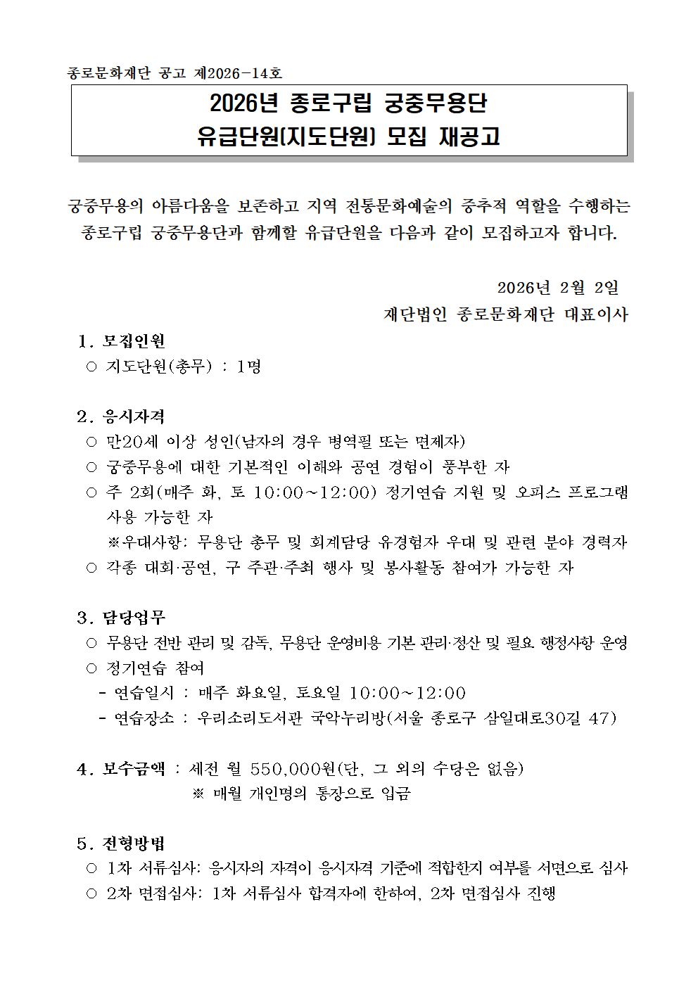 2026년 종로구립 궁중무용단 유급단원(지도단원) 모집(재공고)
